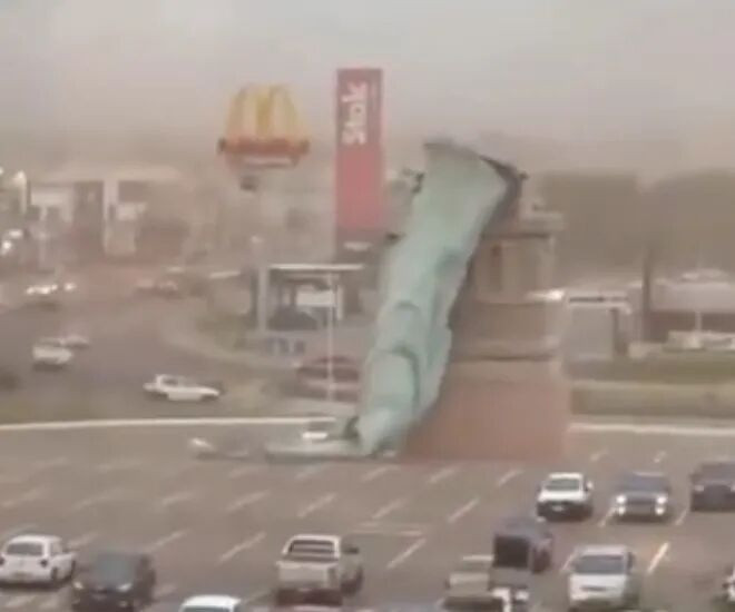 画面中自由女神像复制品垂直倾倒在路中央,一辆停放的汽车险些被砸中。