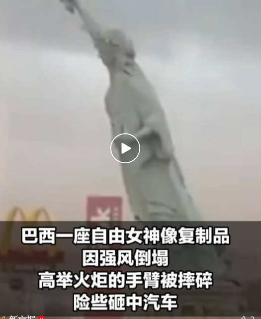 据新京报,12月15日,位于巴西瓜伊巴的自由女神像复制品因强风倒塌,高举火炬的手臂被摔碎。